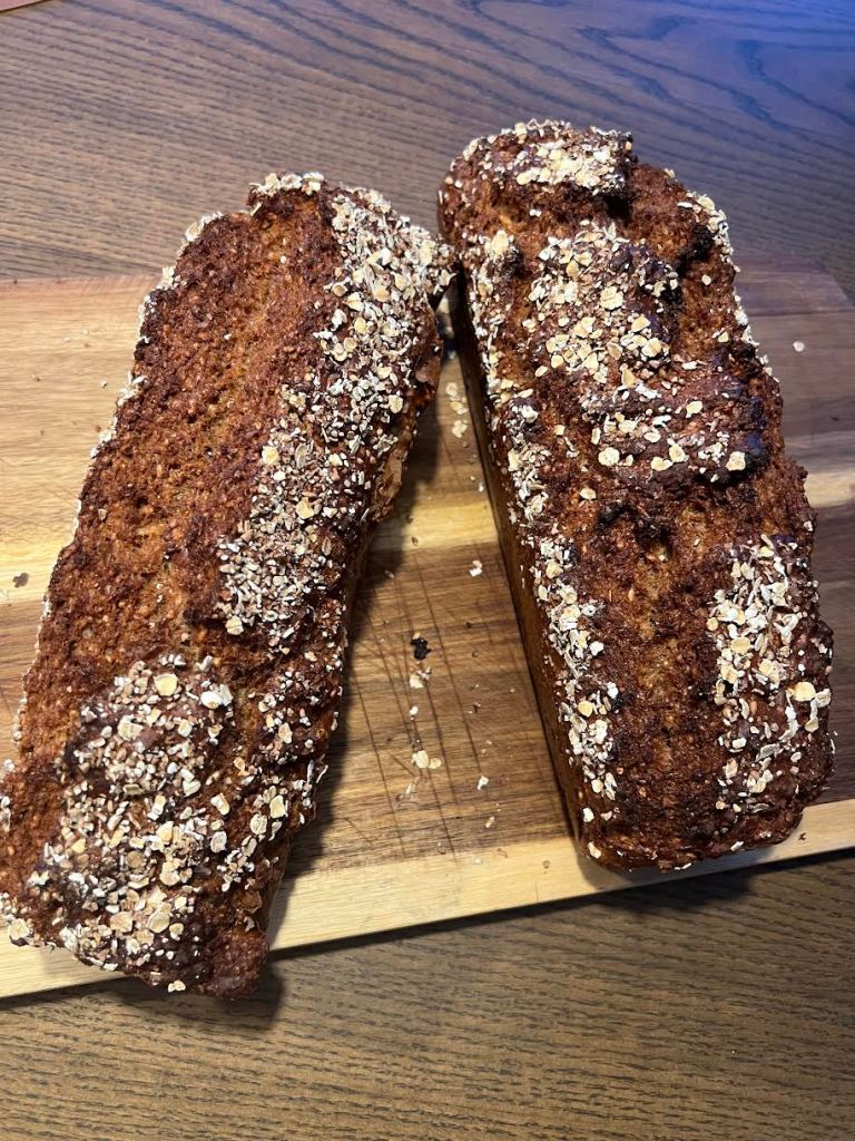 Smöra 2-3 brödformar med smör.Blanda alla torra ingredienser i en skål och rör om, jag har använd bakmaskin. Tillsatt sirap samt filmjölk och rör om till en jämn smet. Fördela smeten i brödformarna. Jag har toppat bröden med havregryn.